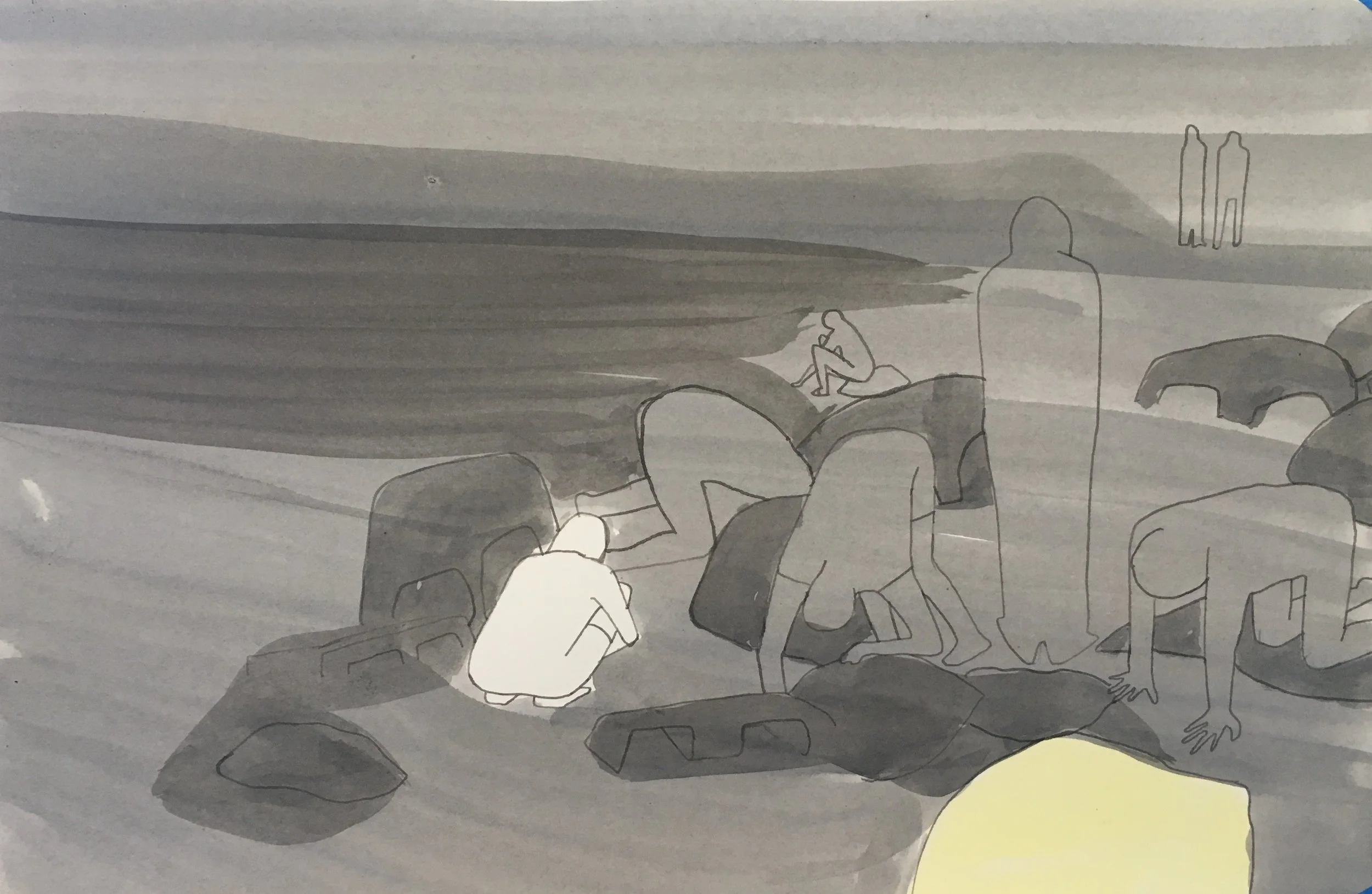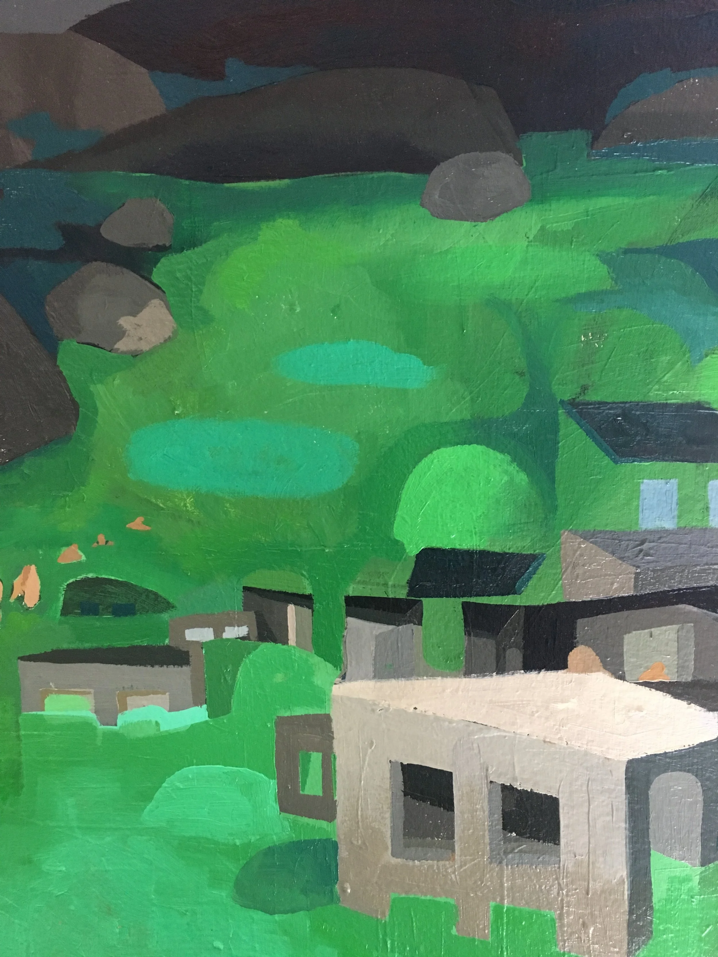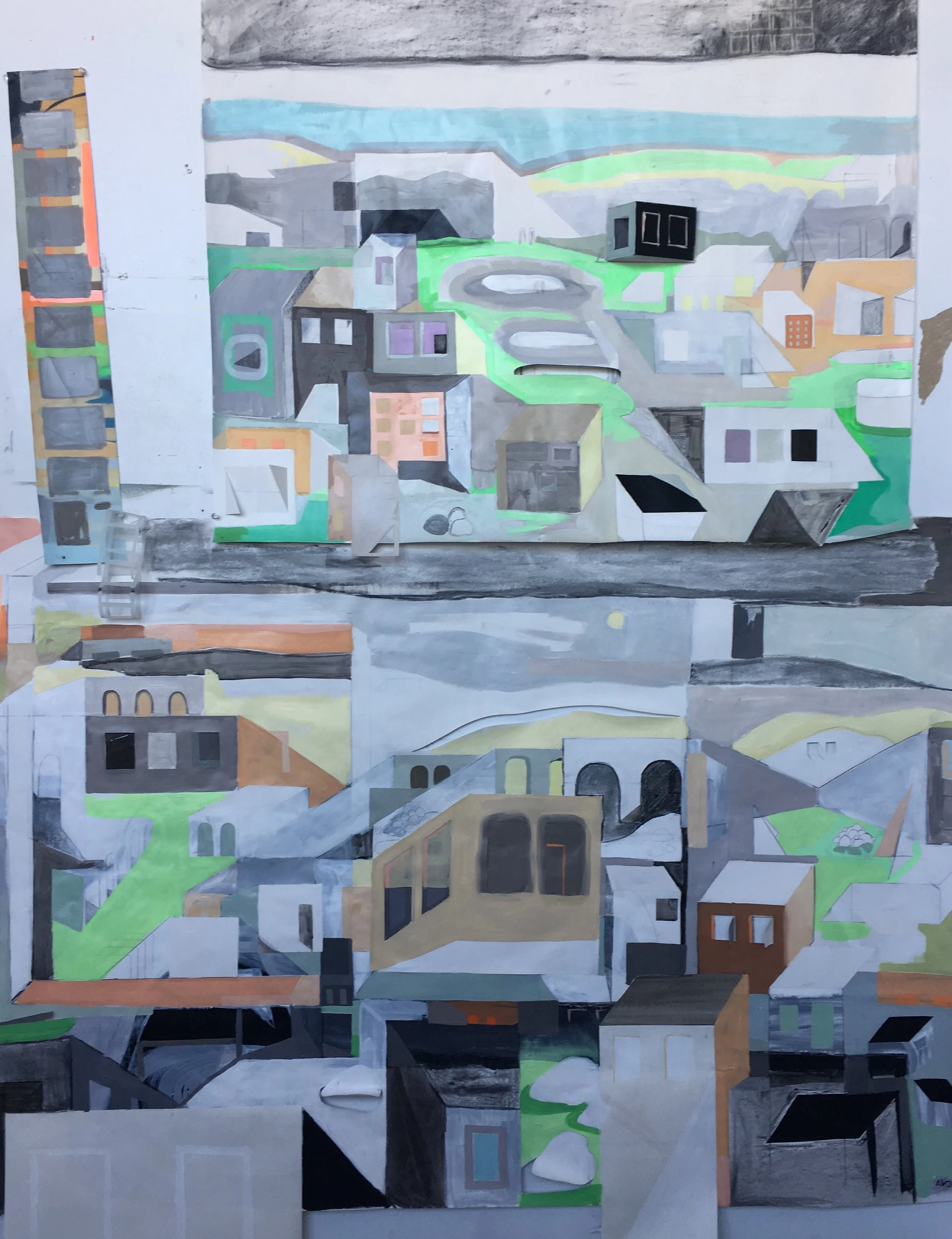 Painting is permission to side-step prescribed thought patterns, to design a new balance, to bring forward questions that require strange logic; to make a world and run around in it. Rationalizing leaves me with a room of plastic furniture. What are the forms that perpetually cycle back? Will painting them out open a new door or will I keep spinning in their loop? In the process: Holding a vigil to not overthink (overpaint); to self-trust. Exorcising ghosts and painting out painter’s forms (shape, color, location). Resisting cinematic, automatic, pretty plastic furniture.